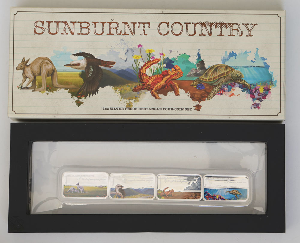 | Description: 2015 Sunburnt Country 4-coin set of 1 oz rectangular coloured silver Proofs: Kangaroos, Kookaburra, Frill-necked Lizard and Turtle. In single box of issue with COA. FDC |