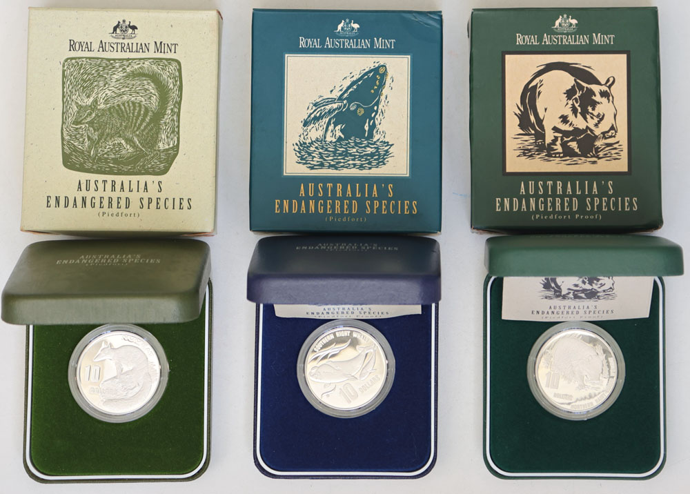 | Description: 1995-1998 Australian Endangered Species silver Piedfort Proof 1995 Numbat, 1996 Whale and 1998 Wombat. In boxes of issue with COA (some marks). (3 items total). FDC |