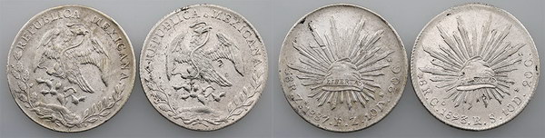 Mexico 8 Reales 1887 ZsFZ, 1893 GoRS. Digs. (2 coins total).