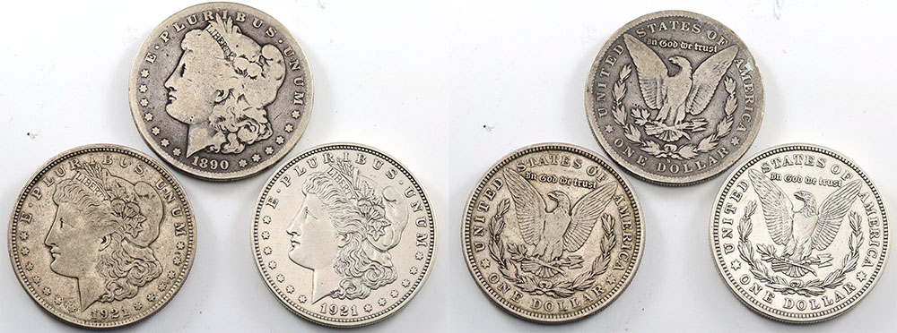 United States silver Morgan Dollars: 1890S, 1921 (2). (3 coins total).