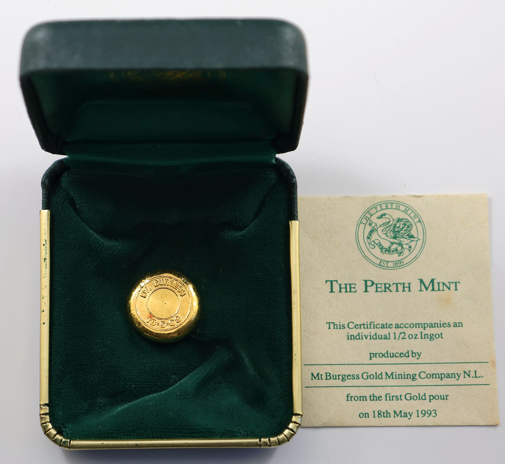 | Description: 1993 1/2 oz gold ingot Mt Burgess Gold Mining Co N.L, assayed and stamped by The Perth Mint from the first gold pour 18-5-1993. In case with COA. VF-EF |