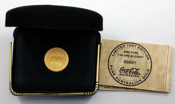 1997 Coca Cola Sovereign (7.4g 99.99 fine gold). In case of issue with COA no 07468. Ex Nobles July 2017 S115, lot 1486.