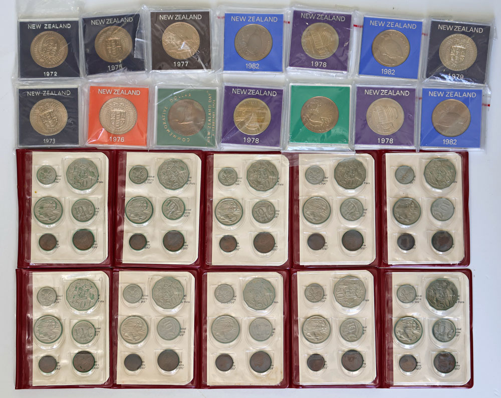 | Description: Australian vinyl Mint sets 1972 (10; toned), New Zealand set of commemorative large size Unc Dollars; 1972, 1973, 1974, 1975, 1976, 1977, 1978 (3), 1979, 1980, 1982 (3). In perspex cases of issue. (24 items total). UNC |