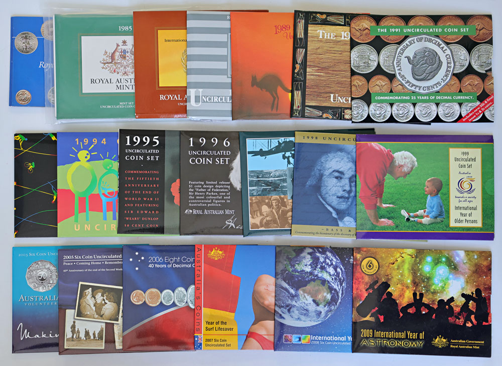| Description: 1984 (yellowed), 1985, 1986, 1987, 1989, 1990, 1991, 1992, 1994, 1995, 1996, 1997, 1998, 1999, 2003, 2005, 2006, 2007, 2008, 2009 Mint sets. Some with minor marks, high catalogue value. (20 items total). UNC |
