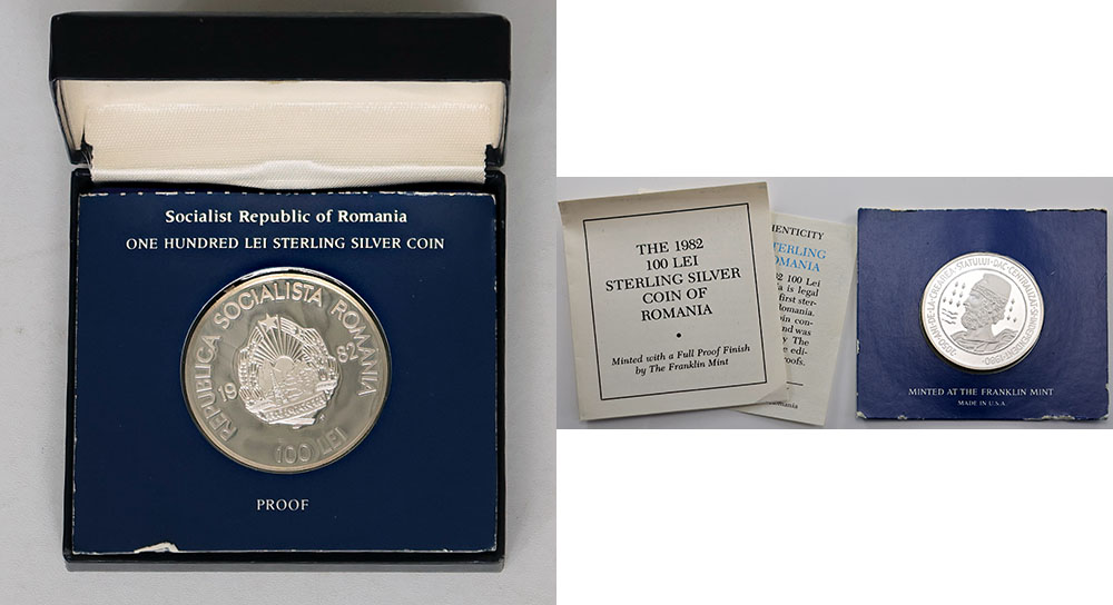 | Description: Romania Socialist Republic 100 Lei silver Proof 1982, Anniversary of First Independent State. In case with COA by Franklin Mint (outer case marked). NGC lists it at $900USD. Rare. FDC |