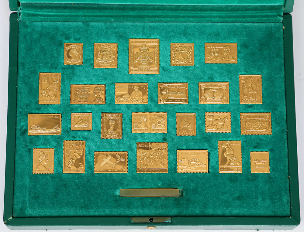 | Description: The Australian Collection of 25 gold-plated sterling silver Spirit of a Nation Stamps (464g 92.5 total). Contains 25 silver stamps, key, and papers. In large case.