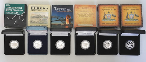 | Description: 1994-2010 Silver Proof commemorative Dollars: 1994, 2004 Eureka, 2007 SHB, 2008 Coat of Arms (2) and 2010 Coinage Centenary. In boxes of issue with COAs. (6 items total). FDC |