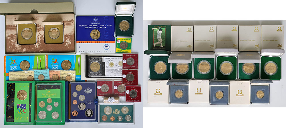 | Description: Assorted 5 Dollar cu/ni Proof issues. Includes: 1988 New Parliament House (5), 1992 Space (in Coin Colony wallet), 1996 Bradman (2, one without box), 1990 Aust/NZ Anzac 2-coin set. Also Unc issues: 2004 Sydney to Athens and 2006 Melbourne Comm Games (2). Also 1 Dollar 1984 cu/ni Proof (3), 1984 RAM Mint roll, RAM 1 Dollars 1994 (M, S, Cx2), 1982, 1985, 1992 Proof sets (no outer packs) and 50 Cents in perspex (1970 x5, 1991). (30 items total). UNC-FDC |