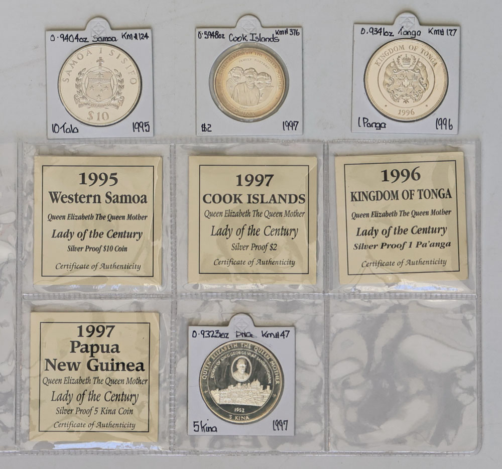 | Description: Lady of the Century set of 4 silver Proofs: Samoa 10 Tala 1995, Tonga 1 Paanga 1996, Cook Islands 2 Dollar 1997 and PNG 5 Kina 1997. With COAs, but coins in flips only (no packs/boxes). (4 coins total). FDC |