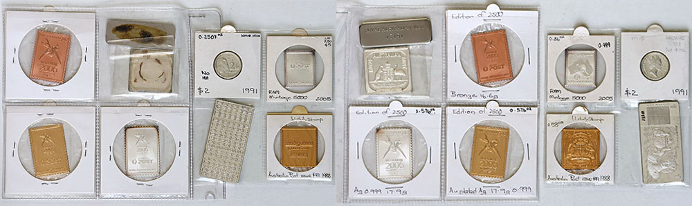 | Description: 2006 Melbourne Comm Games set of 3 silver, gold-plated silver and bronze stamp-coins, Australia Post 1 Pound gold-plated stamp-coin 1988, 2 Pound silver stamp-coin 2005. Also 1991 silver Proof 2 Dollar and silver plaques/ingots from Masterpieces sets (1990 rectangular, 1991 square and another rectangular). (9 items total). UNC-FDC |