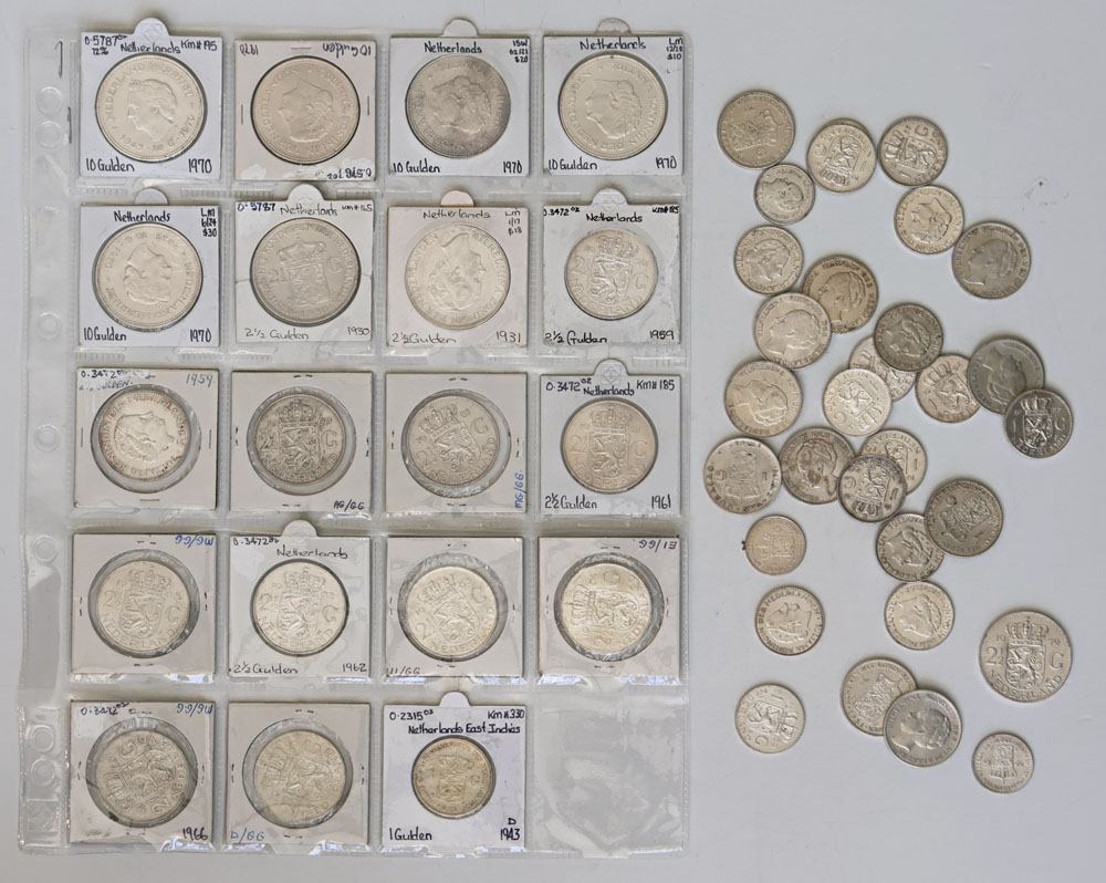 | Description: Netherlands collection. Includes: 10 Gulden 1970 (5), 2.5 Gulden 1930, 1931, 1959 (3), 1960, 1961 (2), 1962 (2), 1963, 1964, 1966 (2), 1 Gulden 1923, 1929 (2), 1930, 1931 (5), 1943D (2), 1944D, 1954, 1955 (3), 1956 (5), 1957, 1958 (4), 1964, 1/2 Gulden 1922, 1929, 1930 (2). (49 coins, approx 13 oz silver total). UNC |