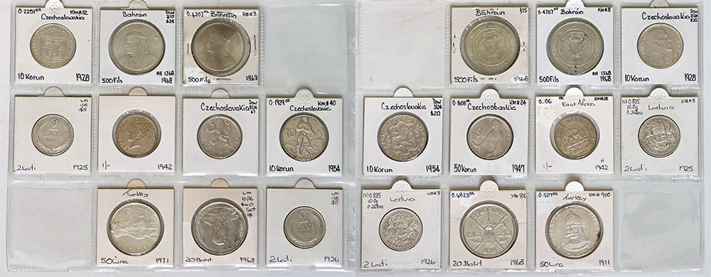 | Description: Bahrain 500 Fils 1968 (2), Czechoslovakia 10 Korun 1928, 1954, 50 Korun 1947, East Africa 1 Shilling 1942H, Latvia 2 Lati 1925, 1926, Thailand 20 Baht 1963 and Turkey 50 Lira 1971. (10 coins total). gVF-UNC |