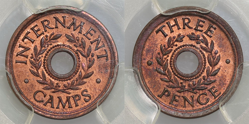 | Description: Threepence Internment Camps copper token WW II. PCGS graded MS 64 RB (25174203). Full red with just a slight hint of tone, only 7 graded higher. Ex The Borg Collection. Ch.UNC/GEM |