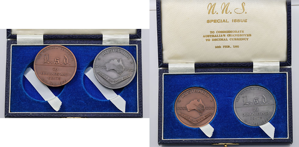 Newcastle Numismatic Society 1966 Decimal Changeover 2-medallion cased set (38mm; look to be copper and pewter).