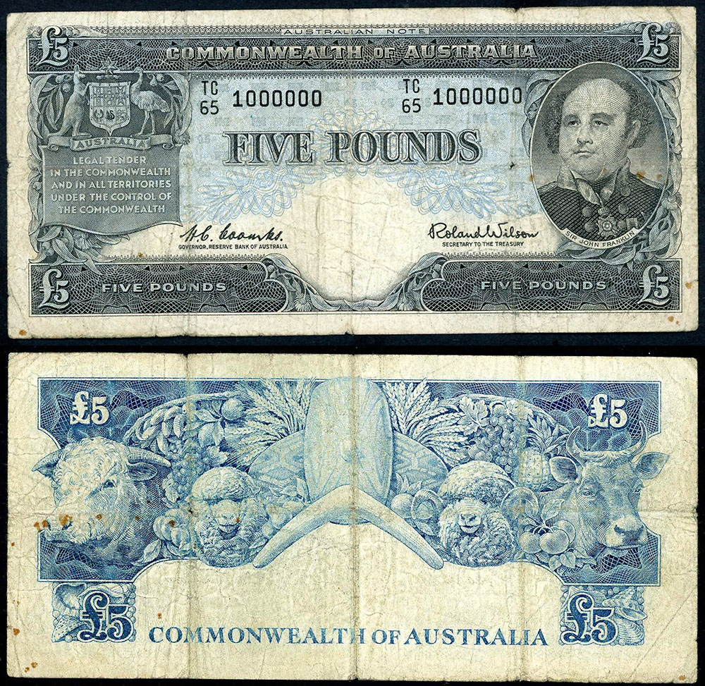 | Description: 1960 Coombs-Wilson (R 50m). Reserve Million serial numbered note. With last digit hand-printed. Old folds with splits in three body intersections and rust spots. Extremely rare, with only 5 known. aFINE |