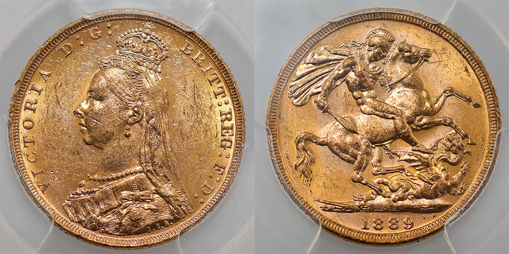 1889M St George Reverse. Victoria Jubilee head. PCGS graded MS 61 (61278138). Second Obverse, Angled J (S. 3867B). Bright bloom.