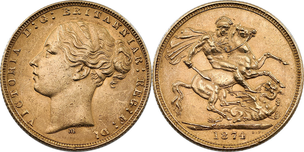 1874M St George Reverse. Victoria Young head. Hairline marks in Obverse field.