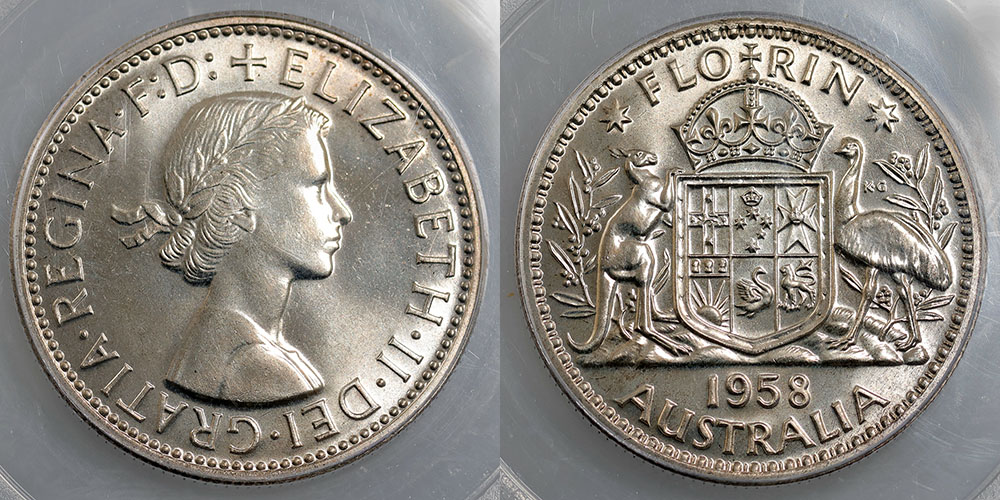 Florin. 1958 Proof Florin. PCGS graded PR 66...