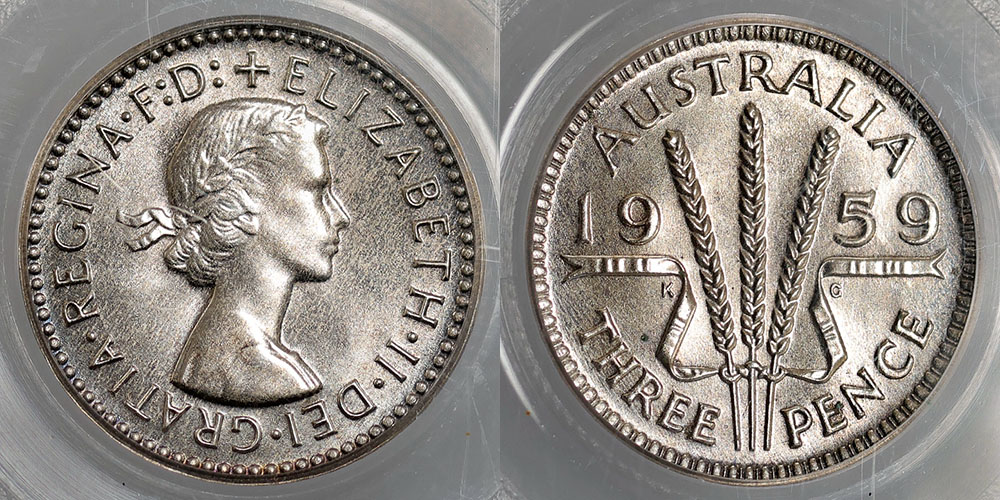 1959 Proof Threepence. PCGS graded PR 65 (12703954). Light tone.