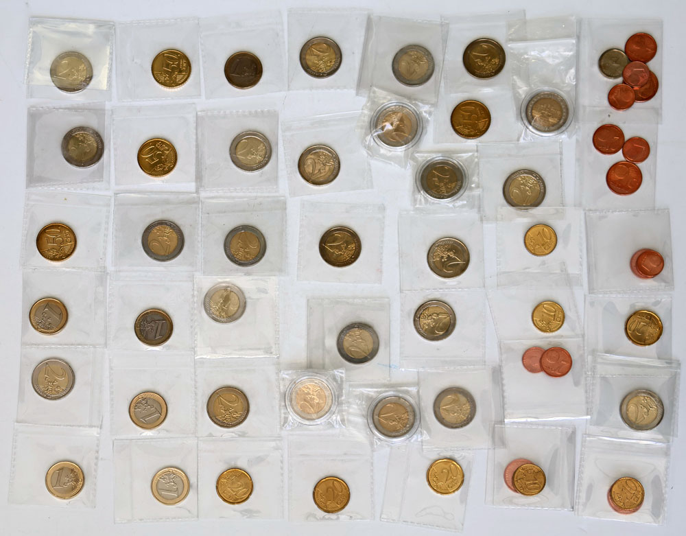 Small collection of early and commemorative Euros. Many non-circulating; Germany, Holland, Austria, Ireland etc. (FV approx 57 Euros, 56 coins total).