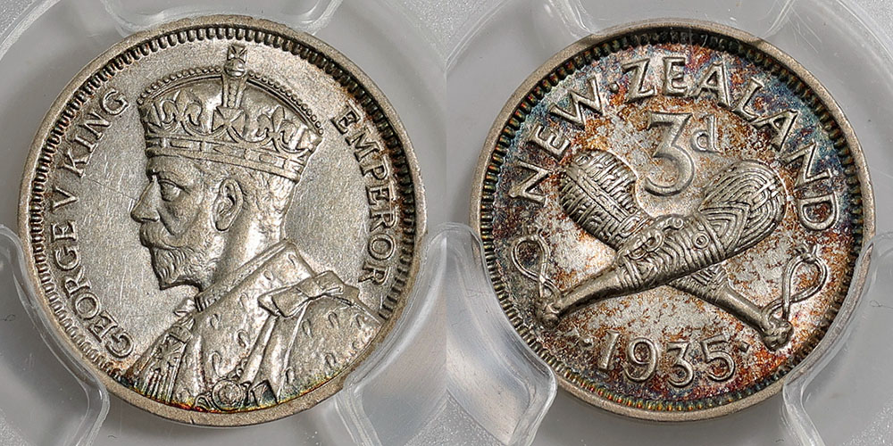 New Zealand Threepence 1935. Key date. PCGS graded AU 58 (29921466). Some tone.