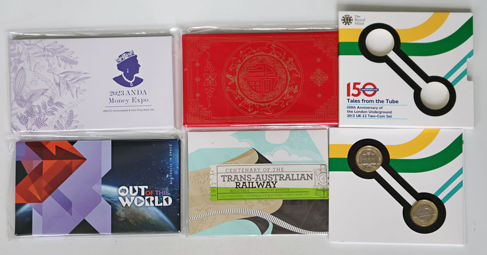 | Description: 2017 Trans-Australian Railway, 2023 ANDA, 2024 Out of this World 4-coin Unc privymark sets and 2023 Lunar Rabbit 2-coin set. Also UK Tales From the Tube 2013 2 Pound 2-coin set. In packs of issue. (5 items total). UNC |
