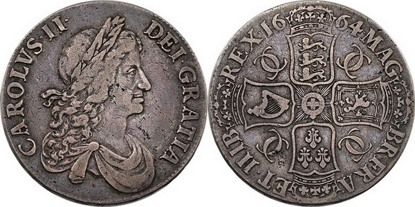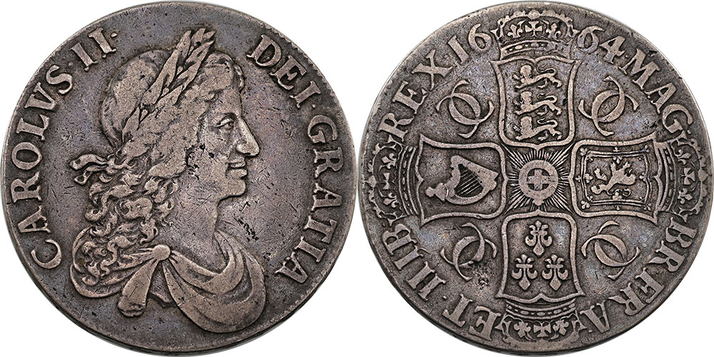 Crown Charles II 1664. Second bust right with crooked ties, Rev crowned shields cruciform, 7 strings to harp (29.39g). Old toned and evenly worn.