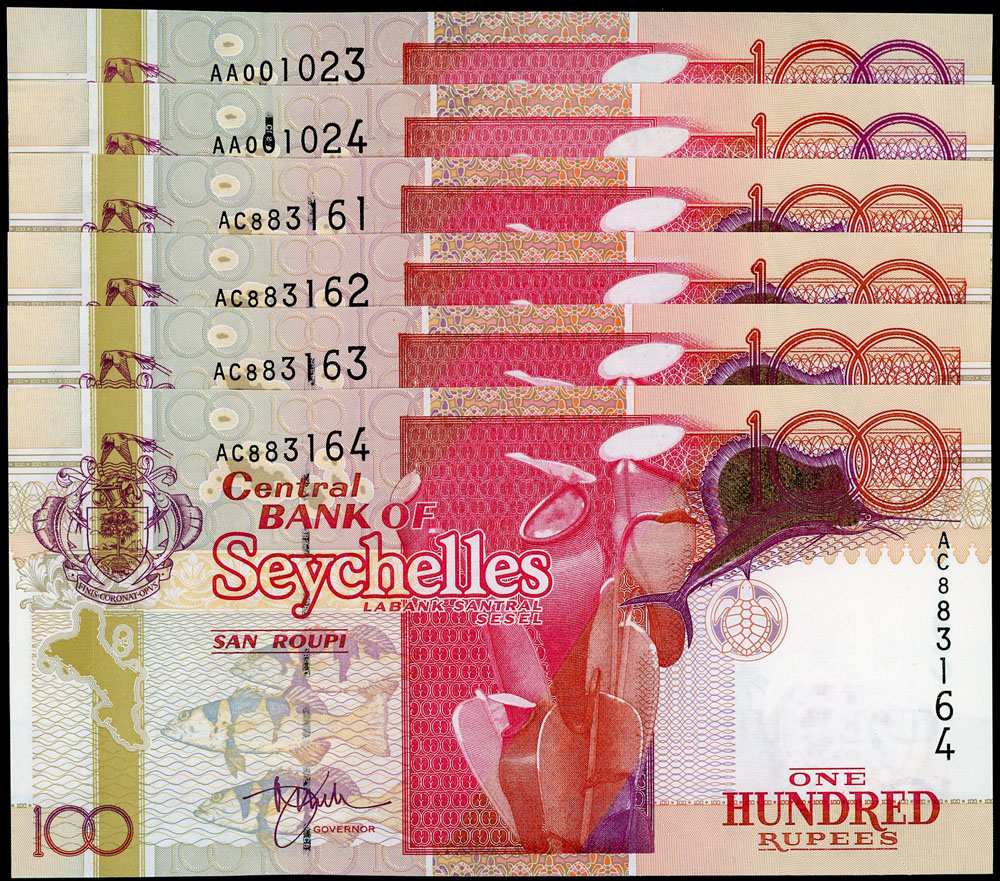 Seychelles 100 Rupees 1998 (P 39) AA00 pair and 2001 (P 40a) run of 4. (6 notes total).