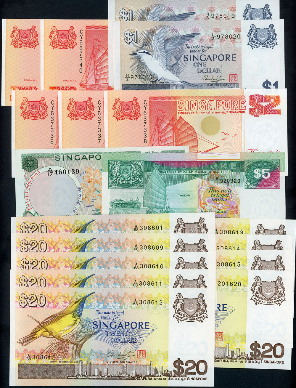 | Description: Singapore 1 Dollar (P 9) pair (flick), 2 Dollars 1992 (P 27) run of 5, 5 Dollar 1967 (P 2a) folds, 1989 (P 19) A/1 with repeater serials 920920 and 20 Dollars (P 12) run of 7 and 2 singles. (18 notes total). EF-UNC |