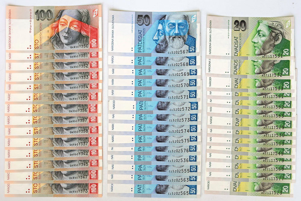 | Description: Slovakia 20 Korun 2017 (P 20a) two trios, a pair and 6 singles, 50 Korun 2017 (P 21a) run of 10 and 4 singles and 100 Korun 2017 (P 22a) run of 9 and 5 singles. (42 notes total). UNC |