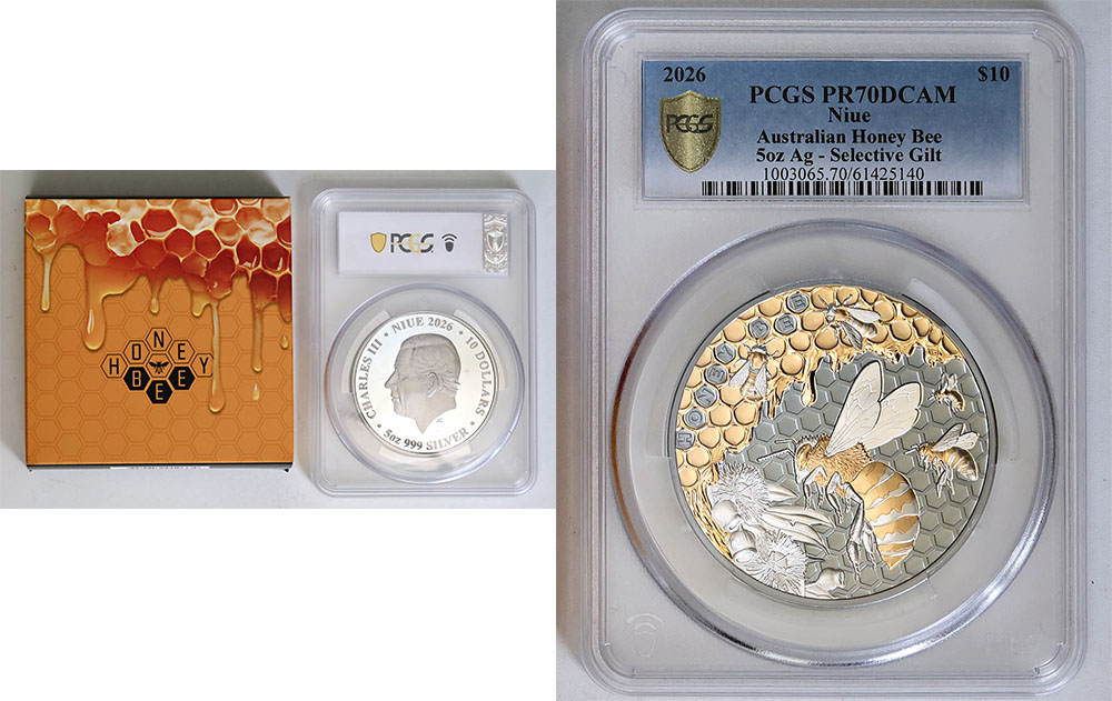 | Description: 2026 Honey Bee $10 Niue 5 oz selectively gold-plated black silver Proof. PCGS graded PR 70 DCAM (61425140). Equal highest graded. A popular issue. Includes box of issue with COA. Rare. FDC |