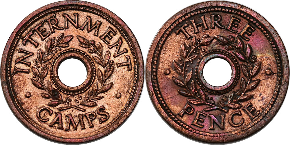 Threepence Internment Camps copper token WW II. Once wiped with red appearance.