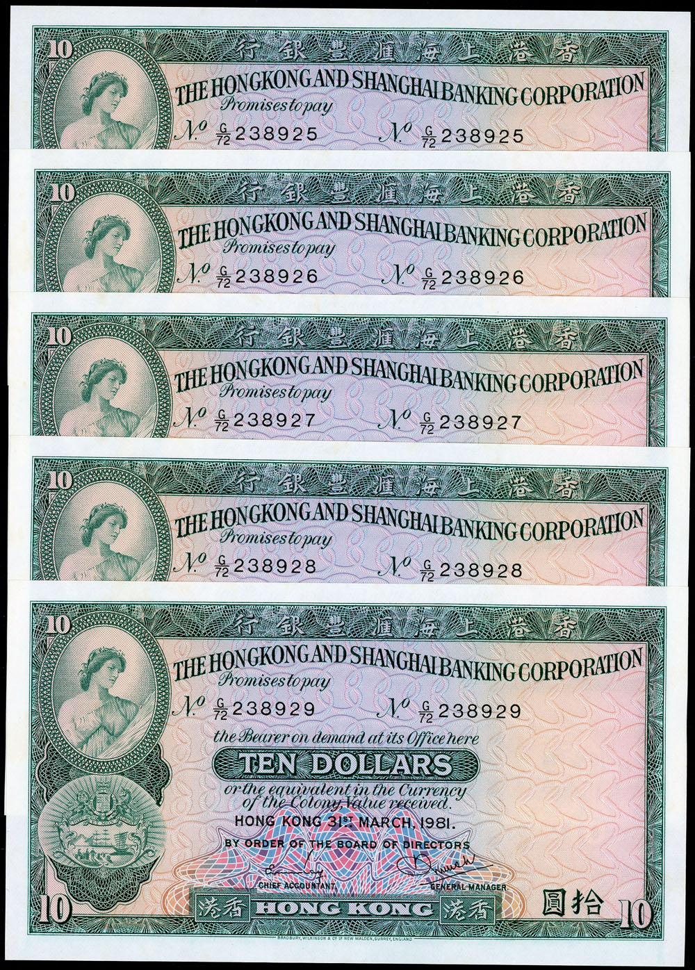 Hong Kong and Shanghai Banking Corp 10 Dollars 31-3-1981 (P 182i). Consecutive run of 5.