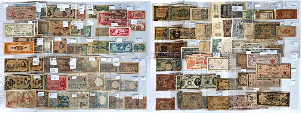 | Description: Allied Forces WW II occupation notes. Includes: GB ration cards (2), Algiers 5 Francs, Ceylon (4), Egypt (4), China (10), Albania (1), Ukraine (1), Denmark (1), Belgium (3), Japan (3), Hungary (3), Croatia (1), China (9), France 9), Greece 9), Poland (7), Serbia (2), French Indochina (5), Hong Kong (4), Fiji (1), Malaya (5), Dutch East Indies (5), Philippines (18). A good selection. (77 notes total). G-aUNC |