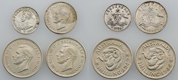 | Description: Shilling. 1942S, 1944S. Also Threepence 1934 and Sixpence 1946 with a minor Reverse planchet flaw. (4 coins total). EF-UNC |