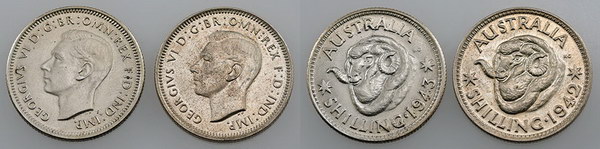 | Description: Shilling. 1942, 1943. Some marks. (2 coins total). UNC |