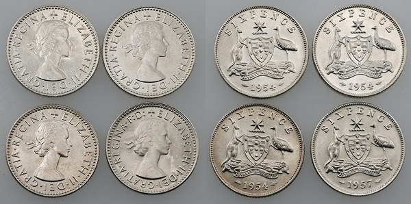 | Description: Sixpence. 1954 (2), 1957 (2). Light tone with bloom. (4 coins total). Ch.UNC/GEM |