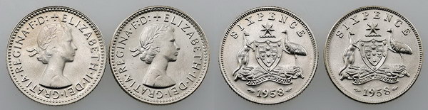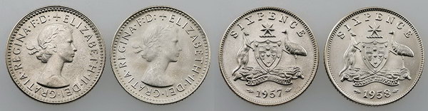 | Description: Sixpence. 1957, 1958. Light tone with bloom. (2 coins total). Ch.UNC/GEM |