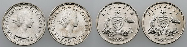 | Description: Sixpence. 1958, 1959. Light tone with bloom. (2 coins total). Ch.UNC/GEM |