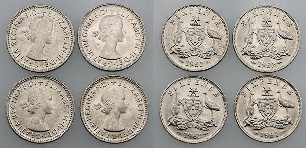 | Description: Sixpence. 1962. Light tone with bloom. (4 coins total). Ch.UNC/GEM |