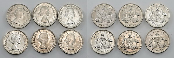 | Description: Sixpence. 1962. Light tone with bloom. (6 coins total). Ch.UNC/GEM |