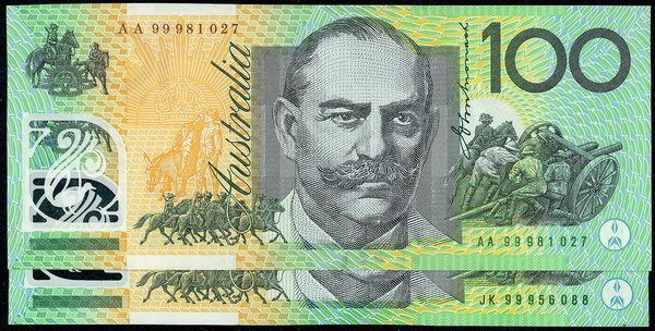 | Description: One Hundred Dollar. 1998 polymer MacFarlane-Evans CF 98 (R 618aL) (centre folds, flick) and First Year prefix AA 98 (R 618aF) (folds, two staple holes). (2 notes total). F-VF |