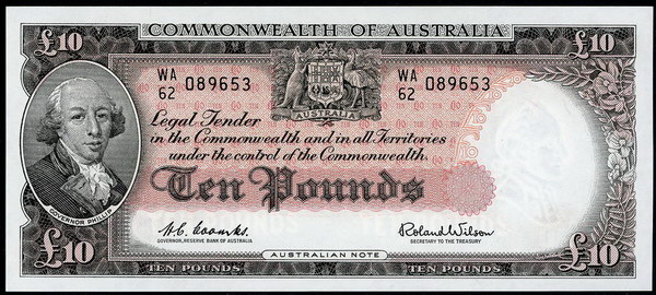 | Description: Ten Pound. 1960 Coombs-Wilson WA/62 (R 63X). NPA issued Last prefix. Light transverse fold, handling. aUNC |