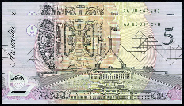 | Description: Five Dollar. 2012 polymer Stevens-Parkinson EA 12 (R 222aL) consecutive pair, 2016 Wattle Stevens-Fraser EJ 16 (R 224L) consecutive pair. Also First Year Prefix Stevens-Parkinson BA 13 (R 222bF) consecutive pair and standard issues 2001 Federation (R 219), 2015 Stevens-Fraser (R 223) consecutive pair. (9 notes total). UNC |