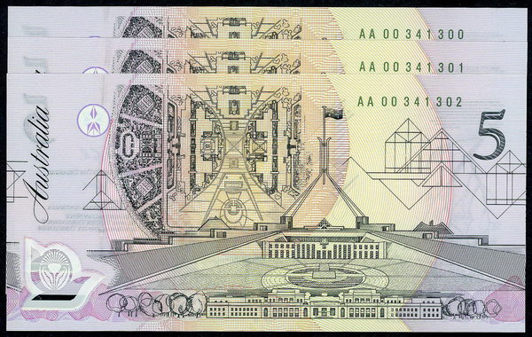| Description: Five Dollar. 1995 polymer Fraser-Evans AA 95 (R 217AA). Recoloured wide orientation bands (circulation issue). Consecutive trio. UNC |