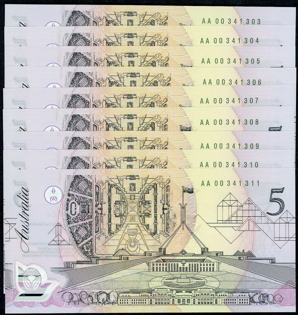 | Description: Ten Dollar. 1998 polymer MacFarlane-Evans AA 98 (R 318cF). First Year prefix. Consecutive run of 5. Catalogues at $500. UNC |