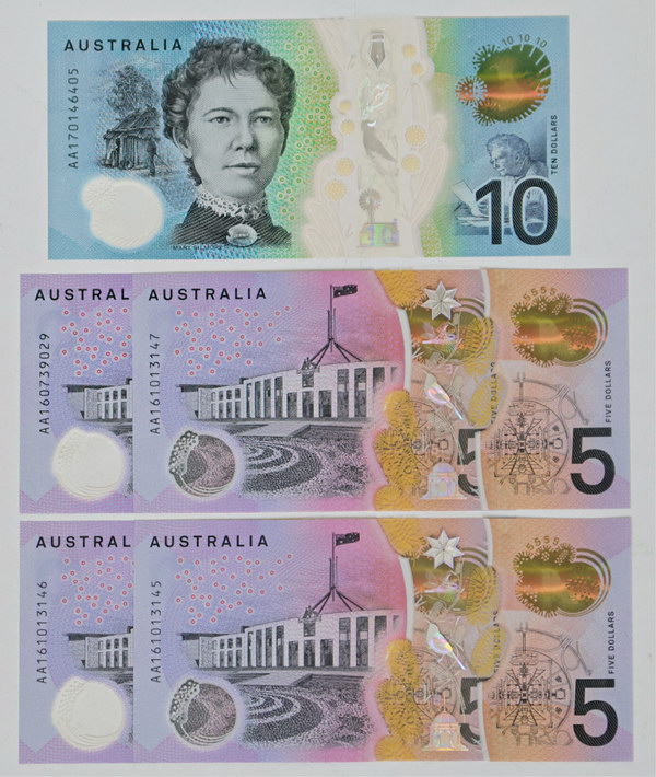 | Description: Five Dollar. 2016 polymer Stevens-Fraser AA 16 (R 224F) consecutive trio and single. Also 10 Dollars 2017 Lowe-Fraser EA 17 (R 326L). Last year/signature prefixes. (5 notes total). UNC |