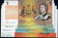 | Description: Assorted. 1 Dollar 1982 Johnston-Stone (R 78) (consecutive run of 14) raised watermark, flick, last with a corner fold, 2 Dollars 1985 Johnston-Fraser (R 89) (consecutive run of 10) and 5 Dollars 1985 Johnston-Fraser (R 209a) (consecutive run of 5) centre fold. (29 notes total). aU-UNC |