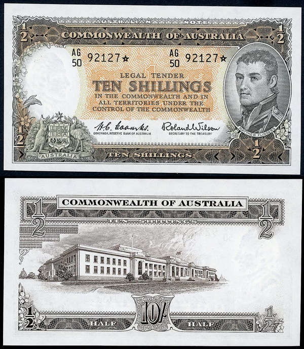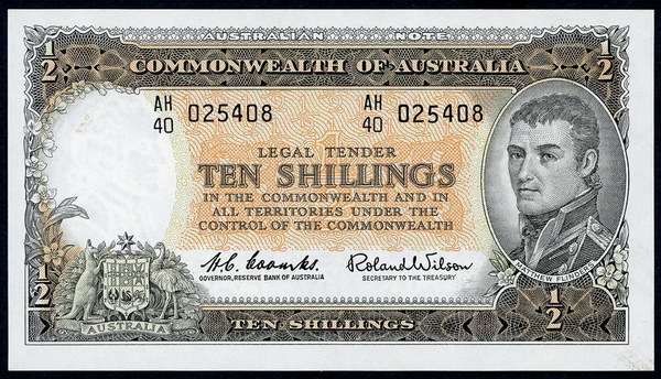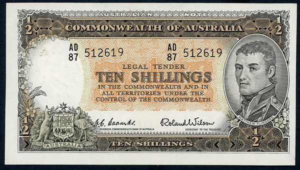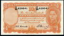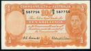Description: Ten Shillings. 1954 Coombs-Wilson (R 16). Commonwealth. Printed slightly off-centre and a little wavy along top, flick and centre bend.   aUNC