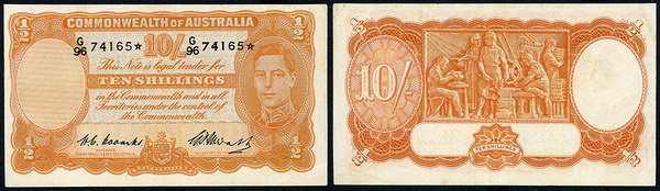 Description: Ten Shillings. 1949 Coombs-Watt G/96 (R 14sF). First prefix star note. Flattened of folds.   VF